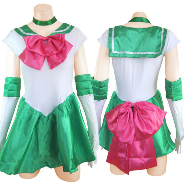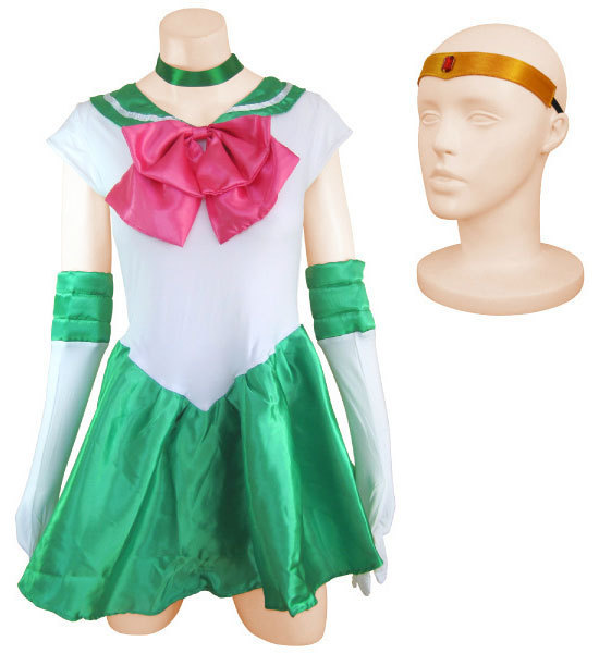 ティアラやグローブの小物も充実!スカート一体型ワンピースのセーラー戦士コスチューム(グリーン)。可愛らしい胸元の大きめピンクリボンは取り外し可能!7色揃えてなりきりたいアニメキャラのコスプレ衣装です。