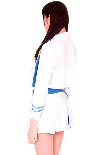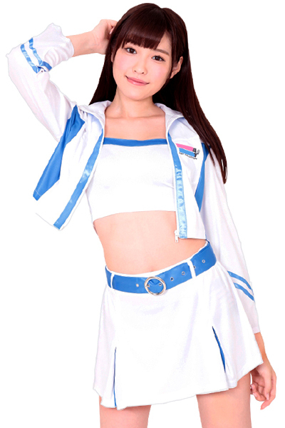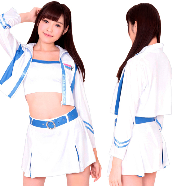 「あたしが来たからには絶対に負けないぞ!」ヘソ出し&ミニスカのセクシーな衣装で全力応援する、レースの女神様!白×水色の色使いが爽やかな印象を与える、レースクイーンコスチューム。
