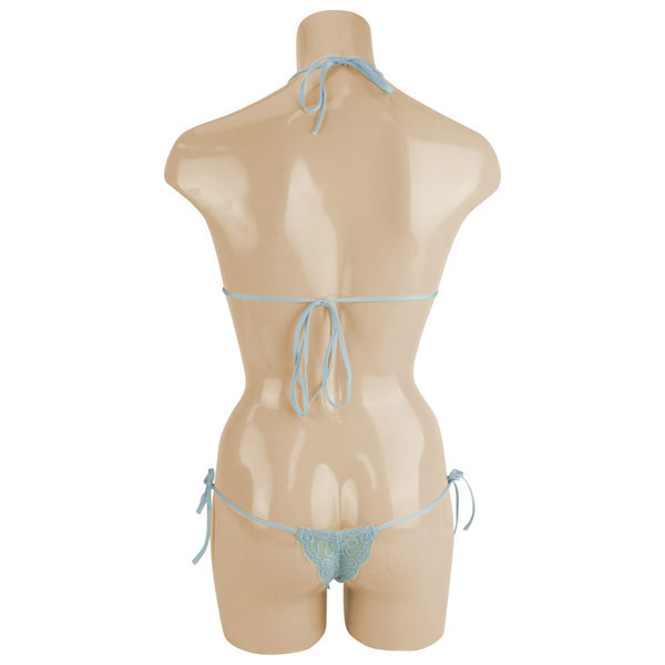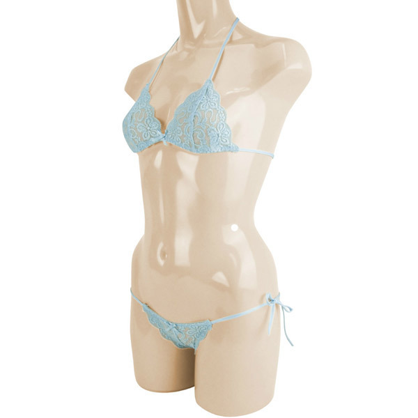 ●爽やかなサックスカラー●あらゆる箇所がうっすら透けて見えるシースルー生地を使用●繊細で美しい花柄刺繍入り●自由にサイズ調節ができる紐タイプ●Mサイズ・日本製。