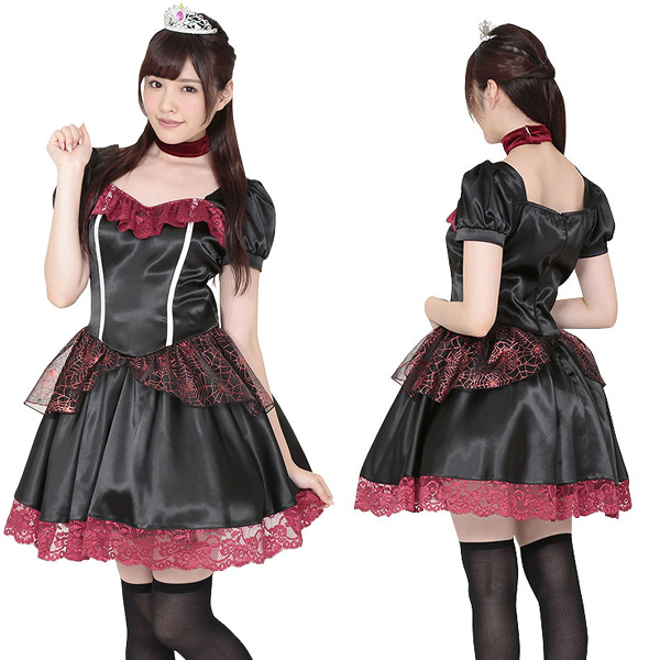 黒の艶やかな生地にアンティークな風合いのレッドスカラップレースをあしらい、ウエスト周りには蜘蛛の巣デザインのレースを施したゴシックスタイル!付属している真紅のチョーカーとキラキラ輝くティアラを身に付ければ、気分はもう闇堕ちプリンセス♪ハロウィン気分を更に盛り上げるなら、タトゥーシールを貼ってみるのも◎