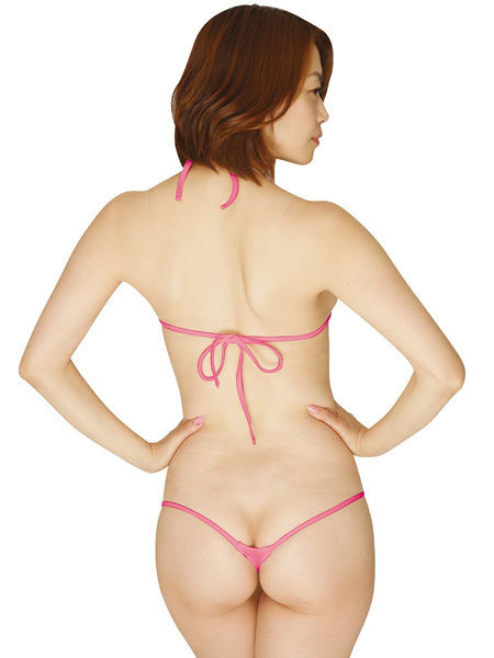 ピンクのセクシービームが彼氏のハートを狙い撃ち!小さな三角形のブラとほとんど隠せていないショーツがなんともセクシーでたまりませんね♪ブラジャーの後ろ部分はリボン結びで簡単に解けるので彼氏を悩殺するときにも◎。