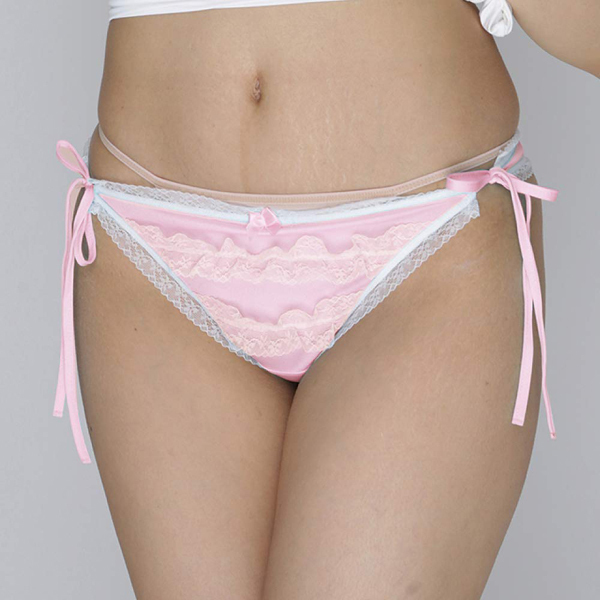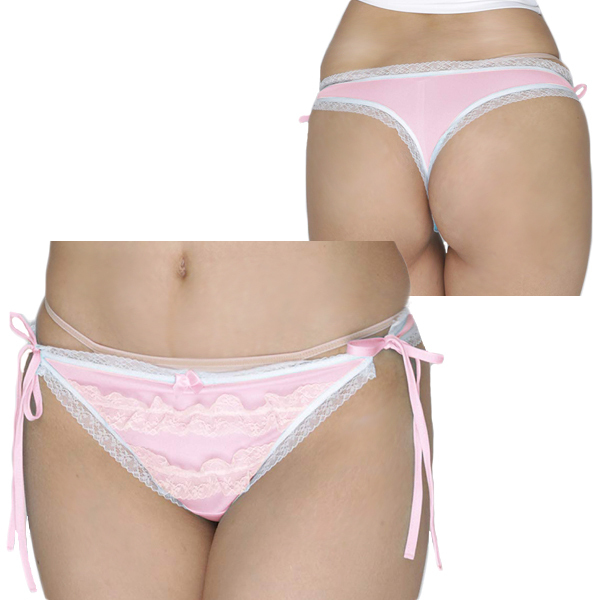 光沢感のあるピンクの生地に白のレースとフリルをあしらった愛らしい日本製Tバック(ピンク)。サイドは紐を結んで留める仕様で着脱楽々です♪