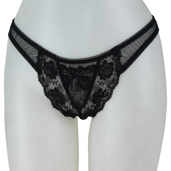 繊細な花柄レースでエレガントに飾る極薄生地の日本製Tバック(黒)。生地から透けて見える素肌と華やかな刺繍に大人の色気を感じる一枚♪少し大きめサイズ。