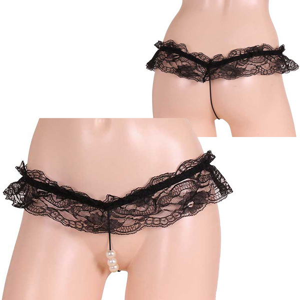 エロさ際立つこちらのひもパンは、ブラックのレースひもがなんともセクシー!1.5cmの大粒パールが秘密の花園を刺激するショーツがたまりません。