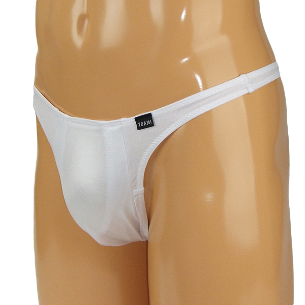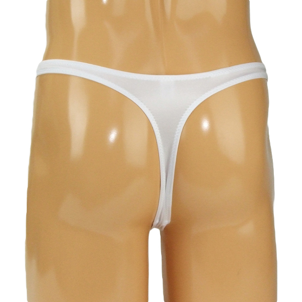 滑らかな光沢放つストレッチ生地を使用した清潔感のある白の日本製Tバック。