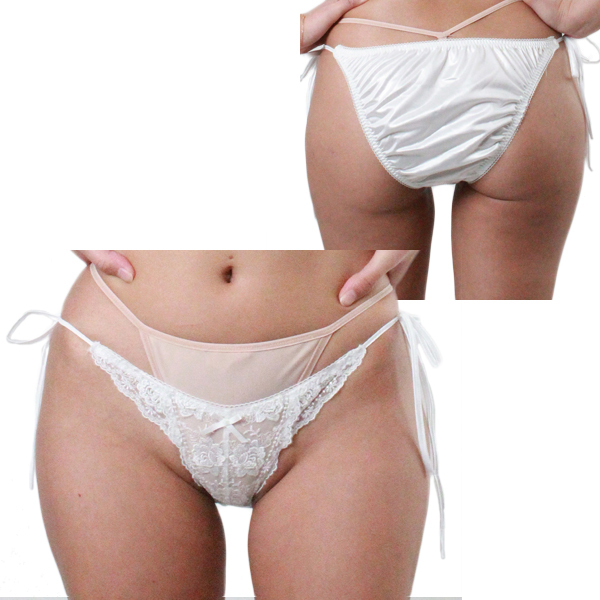 パートナーに可愛く見られたい夜に、光沢生地をフリルレースで飾った日本製フルバック。2段にあしらったレースで愛らしく見せつつ、両サイドの紐結びで甘く誘惑するレディース用の紐ショーツです♪◎ホワイト、Lサイズ