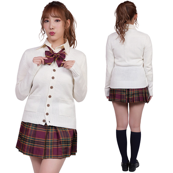 強気なスカートのカラーに甘いホワイトのセーターを組み合わせた鬼可愛制服。ブラウス・セーター・スカートの3点セットは愛のしるし♪