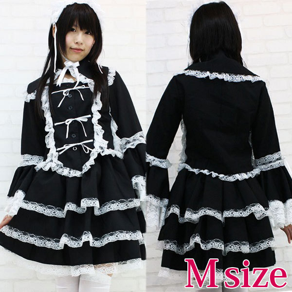 Mサイズ:B76〜82cm・W64〜100ccm 丈:上着48cm(袖62cm・肩幅37cm)・スカート47cm セット内容:ジャケット(前ボタン留め、姫袖)・別衿・ヘッドドレス(総レース仕様、バラのコサージュ付き)・スカート(ウェストゴム入り)