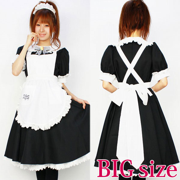 - BIGサイズ:B92〜100cm・W78〜84cm 丈:ワンピース108cm(袖丈30cm)・ペチコート67cm セット内容:ワンピース(後ろファスナー、袖パフスリーブ、袖、襟繰りにレース付)・エプロン(肩紐下部にボタン付、ポケット付)・ペチコート(裾レース付、ウェストゴム仕様)・カチューシャ(全フリル)・ブローチ(安全ピン付)・メイドキャップ(クリップ付)