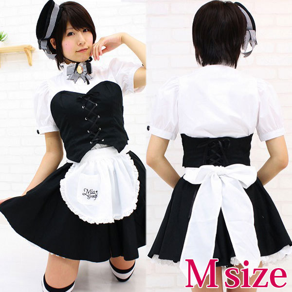 人気メイドカフェの制服が登場!ビスチェとふんわりミニ丈スカートのオシャレなメイド服!帽子や、ブローチ、カチューシャと小物も充実して、完璧なミアカフェメイドさんになれちゃうコスプレ衣装です。