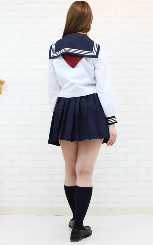 白の3本ラインが特徴の上着はサイドファスナー仕様、スカートはアジャスターでサイズ調節も可能!赤色のスカーフがcuteなスクール制服コスプレです。