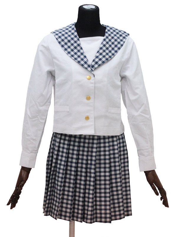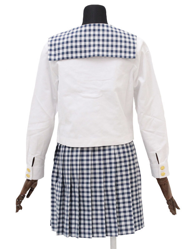 フロントと袖口の金ボタンがポイント!紺色ギンガムチェックのセーラー服コスプレ。