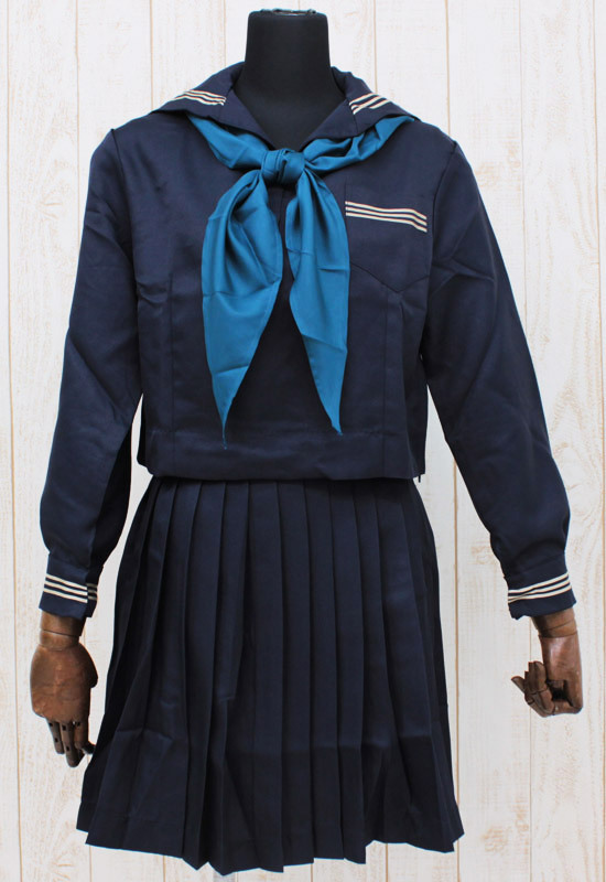 ●長袖セーラーブラウス&プリーツスカートは定番の紺色●襟・袖・胸ポケットにシルバーグレーの3本ライン入り●グリーン系の可愛いスカーフ。