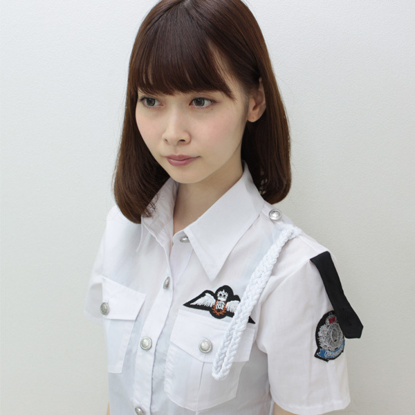 ボディラインに寄り添う美シルエットの白シャツと、短め丈のタイトスカートでセクシーに決まる婦人警官のコスプレ衣装です。