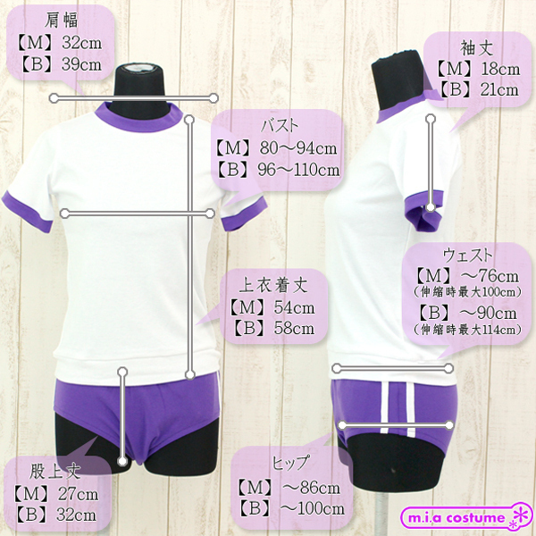 シンプルな体操着にパープルカラーを取り入れた可愛い体操服コスプレ♪このほかにも様々なカラーバリエーションをそろえておりますので、そちらも是非あわせてご覧くださいませ。