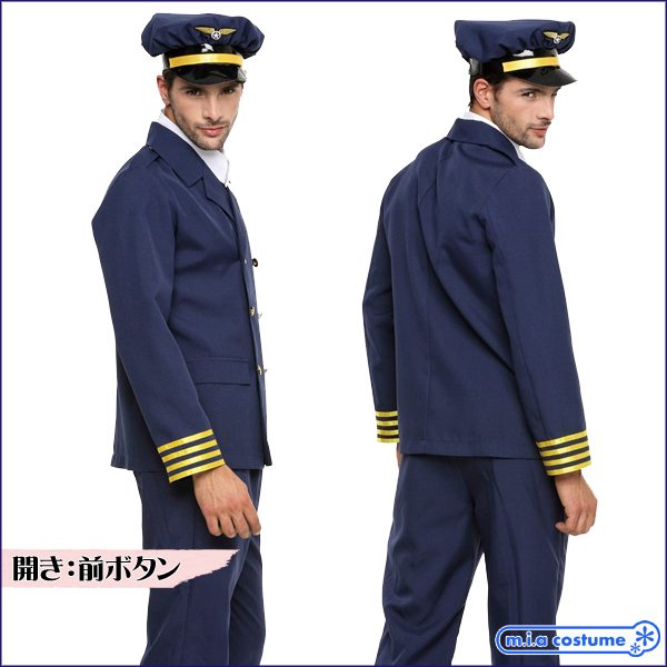 落ち着きのある紺の制服にゴールドカラーがアクセント!最高にCOOLな男を演出してくれるメンズ用のパイロット風ハロウィンコスプレ♪ジャケットは着脱しやすい前ボタン仕様、付襟やネクタイなど小物付き。