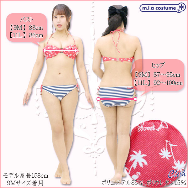 ホルターネック仕様のブラにはヤシの木柄を取り入れ、ショーツには爽やかな青白ボーダーをプリントすることで南国風にまとめた一着♪ブラは着脱可能なパッド付き、日本製