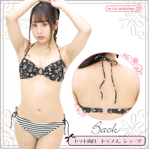 海やプールなどのレジャーシーンで大活躍すること間違いなし!元気で健康的なデザインに、フリルで可愛さをプラスしたホルターネック仕様のブラ&ビキニショーツの2点セットです♪