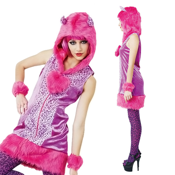 人とかぶらない個性的なハロウィン仮装をお探しの方に!フューシャピンクのビビッドなカラーが注目度抜群な、可愛いヒョウ柄の悪魔コスプレ。