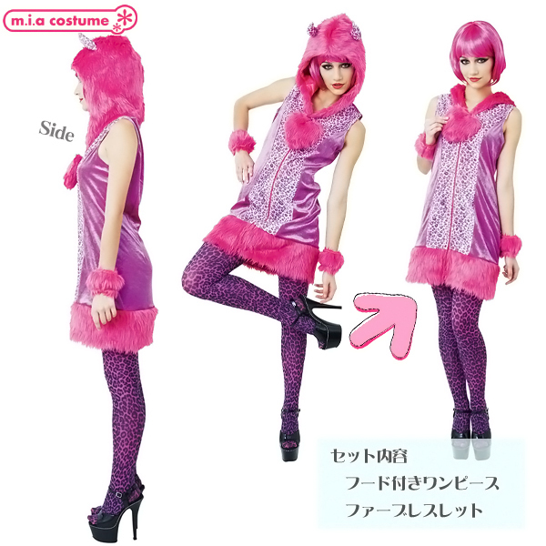 獣感のあるもこもこファーのフード付ワンピースとファーブレスレットで、全身をド派手にコーディネート!近未来から来たようなデザインが可愛いデビル仮装です。