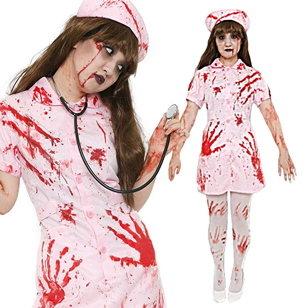 ホラーメイクをすれば雰囲気マシマシ!血糊が付いたピンクカラーのナースコスプレ。