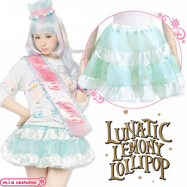 イベント用衣装やパーティーコスプレとしても良さげ♪原宿系カリスマモデル「AMO」がプロデュースする新ブランド「LUNATICLEMONYLOLLIPOP」からティアードスカート(ベビーブルー)が登場!サテンの光沢感とシースルー素材の組み合わせが可愛くて、重ねるボトムスで様々なコーディネイトが楽しめる逸品です。