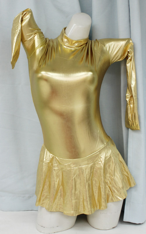 エナメル製のように光沢のある、キラリと輝くゴージャスなゴールドカラー!伸縮性があるので、ピッチリとしたバストやクビレが美しいボディラインを引き立てます!ひらりと軽いスカートから覗く、ハイレグとヒップラインがとってもセクシーなコスチューム!背中のファスナーで脱着衣が可能です。